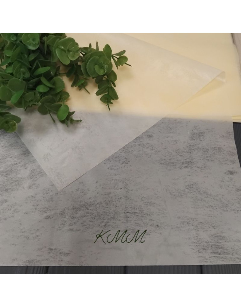М’який, легкий і приємний на дотик, він поєднує в собі оксамитову текстуру та витончений напівпрозорий мармуровий візерунок. Такий папір легко драпірується, не рветься під час роботи та чудово тримає форму.