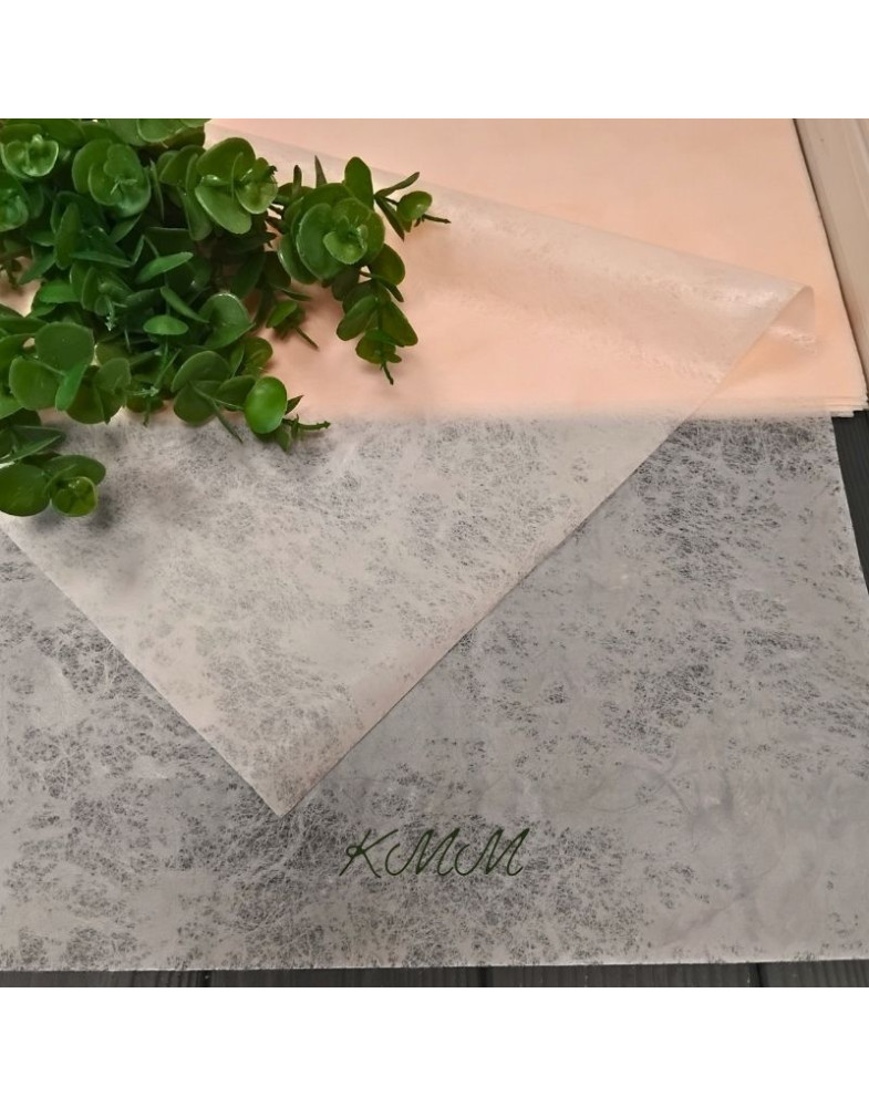 М’який, легкий і приємний на дотик, він поєднує в собі оксамитову текстуру та витончений напівпрозорий мармуровий візерунок. Такий папір легко драпірується, не рветься під час роботи та чудово тримає форму.