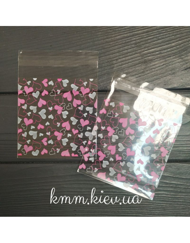 Пакет прозрачный "Сердечки" с клейкой лентой 100х100мм