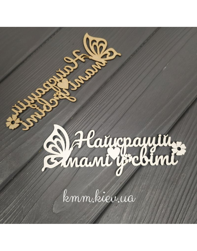 Топпер Найкращій мамі у світі Мах. длина 145мм, мах высота 50мм (размеры могут незначительно отличаться). Топпер деревянный (ДСП) с односторонним белым покрытием. Без отверстия под шпажку. Вставляется в мыльные букеты, цветочные композиции, кондитерские изделия, кладется в подарочные коробки, конверты. Такой декор придаст вашему изделию соответствующее настроение. Добавит еще больше приятных слов к вашему поздравлению.
