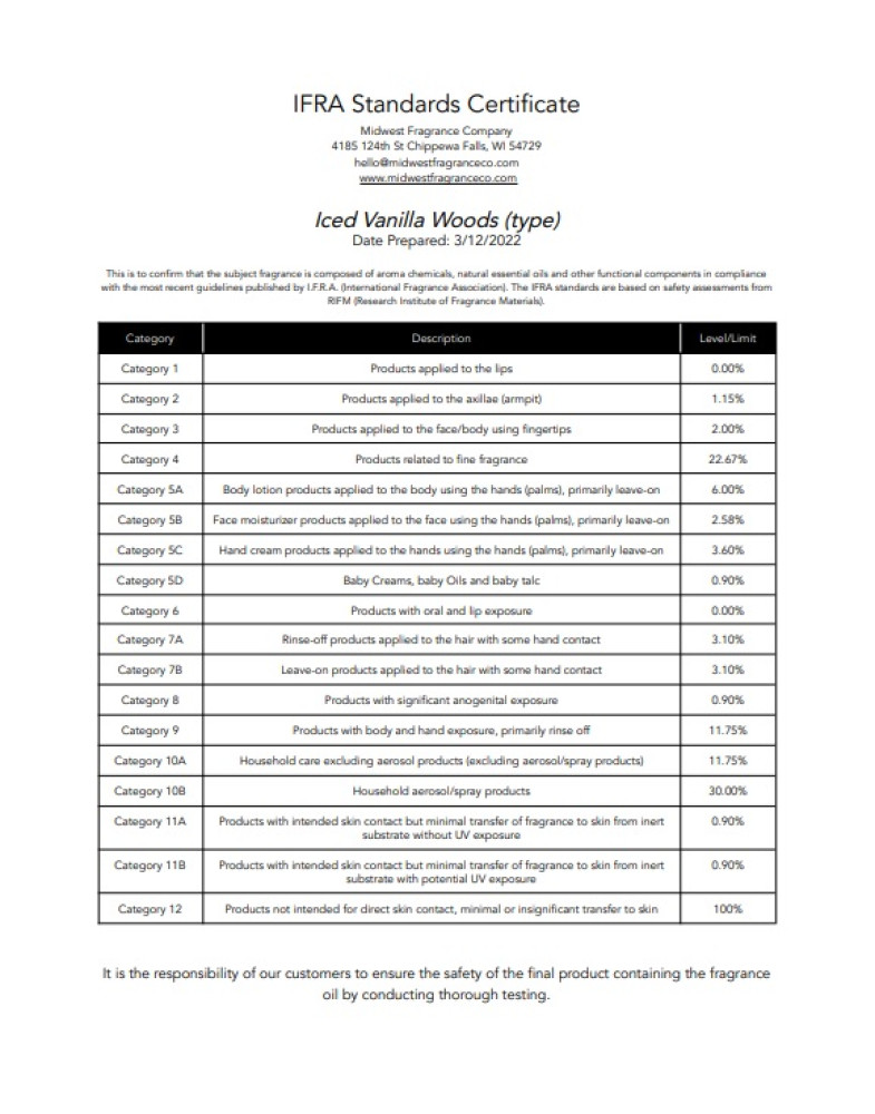 Обсяги використання віддушки є лише рекомендаціями. Кількість індивідуального використання може змінюватись залежно від бажаної сили аромату, типу воску, основи для мила або косметичного засобу. Максимальні рівні використання див. у сертифікаті IFRA.
