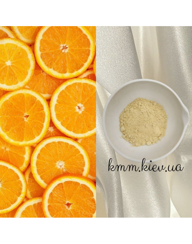 100% чистий та натуральний, органічний, завірений Ecocert Greenlife згідно зі стандартом Ecocert. Плоди збирають вручну, шкірку сушать на свіжому повітрі і подрібнюють на порошок. Дрібна, шовковиста на дотик, пудра світло-жовтого кольору із приємним цитрусовим ароматом. Фруктовий порошок апельсина містить велику кількість аскорбінової кислоти, а також багато цінних харчових волокон. Апельсиновий порошок містить рекордну кількість вітамінів, таких як вітамін С, А, PP, вітаміни групи B, а також цілий комплекс мінералів: цинк, мідь, фосфор, калій, натрій, марганець, фруктові кислоти (яблучну, лимонну), біофлавоноїди. Аюрведична пудра (порошок) Апельсина мають пілінговий та тонізуючий ефект. Забирає надлишки шкірного жиру, але при цьому зберігає шкіру зволоженою. З нього можна виготовляти скраби, пілінги для обличчя та тіла. Маски на основі порошку покращать колір обличчя, освіжать та знімуть запалення. Волоссям надасть сяйва, об'єм і допоможе позбавитися лупи. Найкраще змішувати порошок апельсина з натуральними оліями або зі звичайною водою. В Аюрведі: Апельсин заспокоює Вата та Капха та збільшує Пітту. Вата (ефір та повітря) – принцип імпульсу, необхідний, щоб мобілізувати функцію нервової системи. Капха це тип доші, який підтримує опір організму негативним факторам. Пітта (вода і вогонь) – це «те, що перетравлює» – в організмі представлена травними ферментами, гормонами та відповідає за травлення та обмін речовин. Пітта керує всією метаболічною діяльністю та енергетичним обміном. Властивості порошку Апельсина: