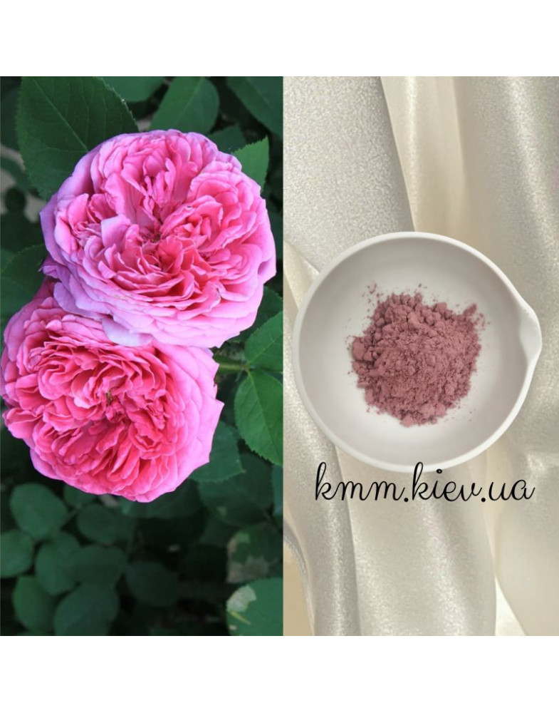 Аюрведична пудра (порошок) Дамаської троянди. Країна виробник – Франція, країна походження сировини – Індія. Натуральний фарбник, ароматизатор, антиоксидант. INCI: Rosa damascena flower powder. Активні компоненти: танніни, галова кислота.