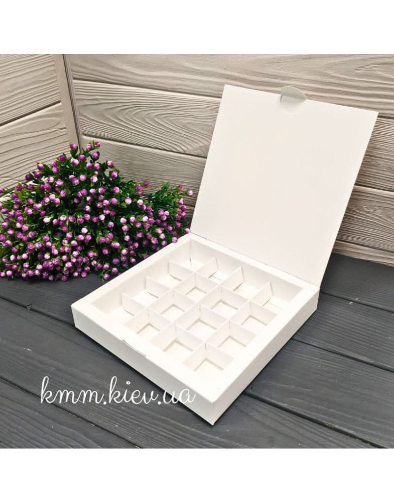 Теги: Коробка, під цукерки, Біла, ложемент, 16 осередків, 185х185х30мм