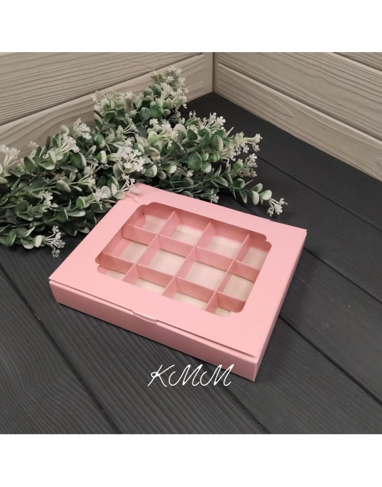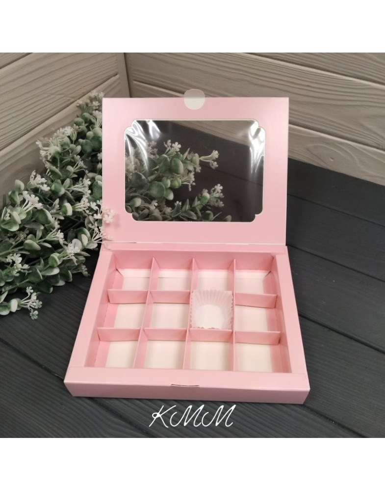 Коробка під цукерки з вікном, з ложементом на 12 осередків 200х156х30мм - Рожевий